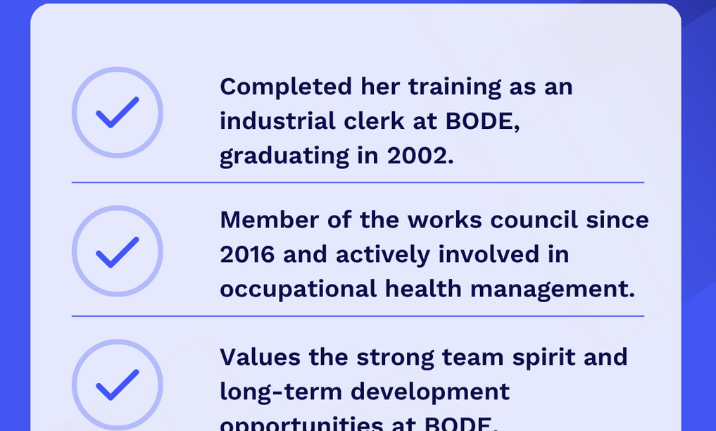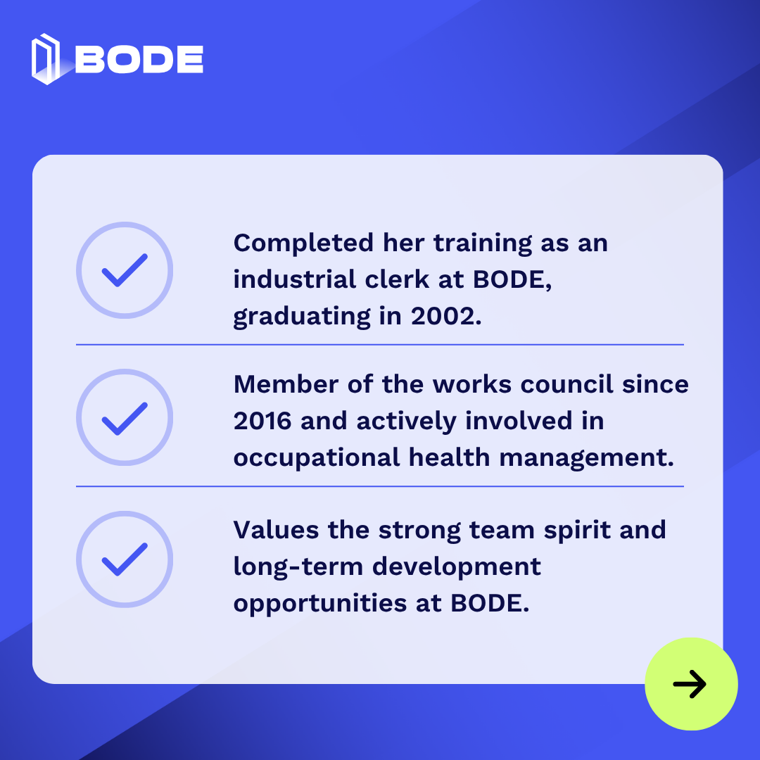 Nadine has been part of the BODE family since 1999. Starting with her apprenticeship as an Industrial Management Assistant, she has continued to grow within the company and now supports our customers and service teams from the Customer Service Back Office.